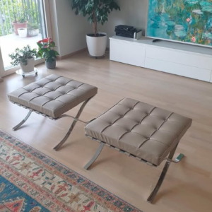Il rivestimento del cuscino del puff barcellona è costituito da 16 riquadri rettangolari di pelle tagliati a mano , bordati e cuciti uno ad uno e assemblati a una fascia di pelle continua , ovvero il perimetro esterno della pelle del cuscino non presenta cuciture di nessun tipo e risulta come pezzo unico