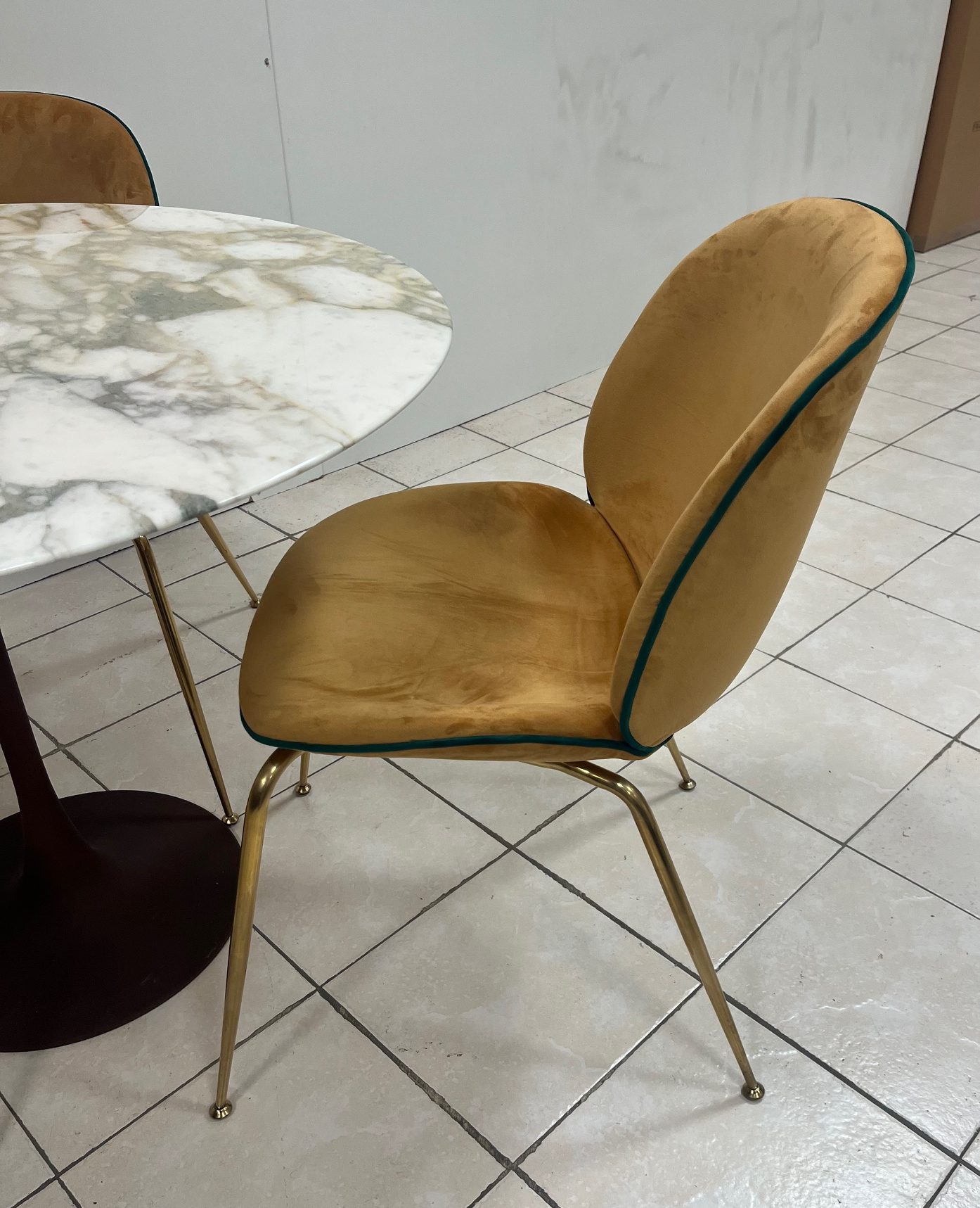 Seduta e schienale in morbido velluto giallo ocra, impreziositi da una raffinata rifinitura del bordo in pelle verde a contrasto.